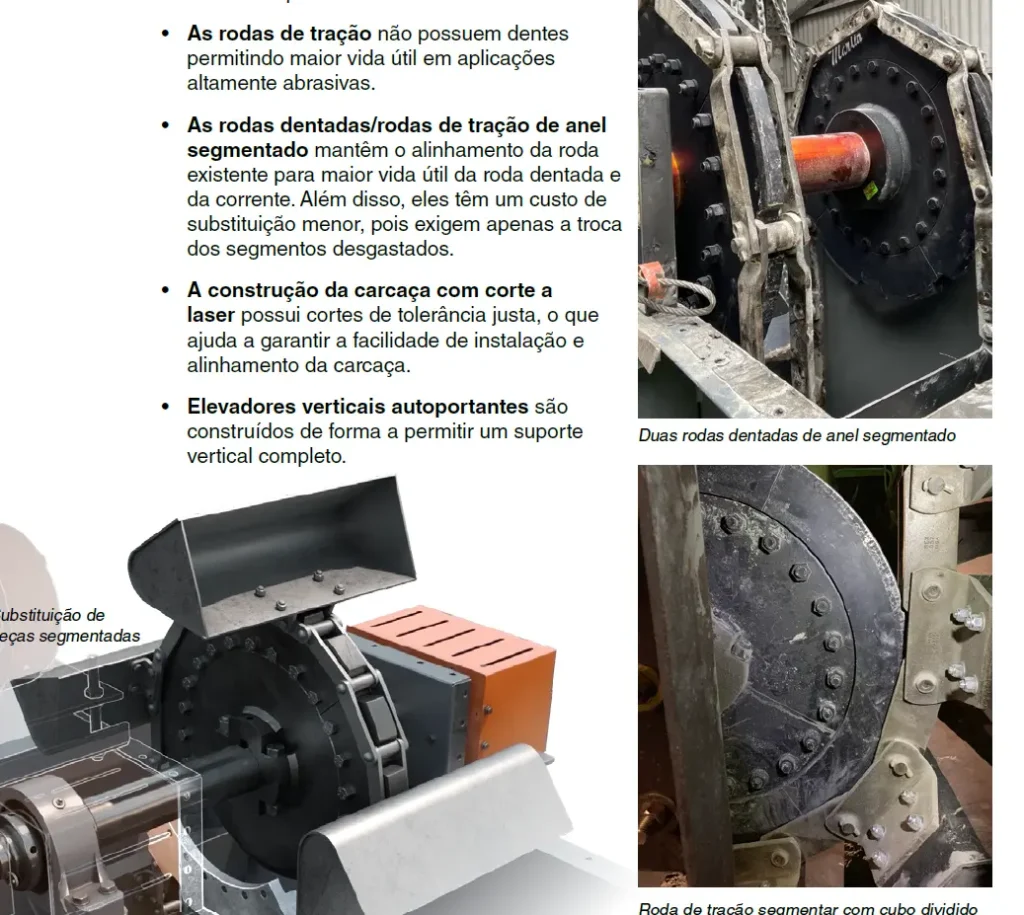 • As rodas de tração não possuem dentes permitindo maior vida útil em aplicações altamente abrasivas.