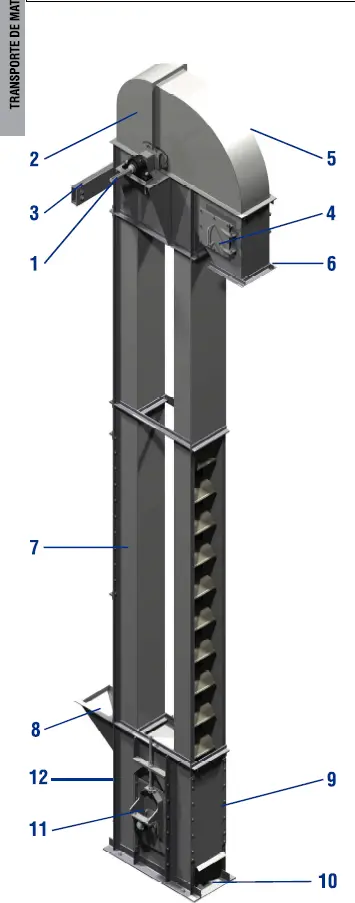 Ele tem uma correia ou corrente sem fim com canecas (buckets) fixadas. Essas canecas: